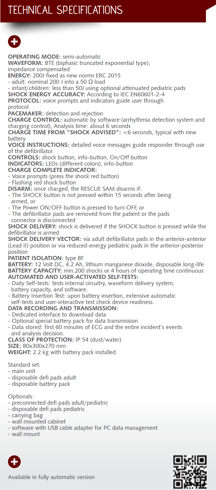 AED-RESCUESAM : AED semi-automatic mode designed for the treatment of VF & VT through voice prompts and indicators guide- Biiphasic Truncated Exponential at fixed 200J for Adult and less 50J for Child on optional Paediatric pads- Pacemaker Detection & Rejection