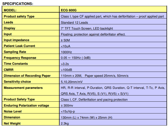 ECG600G : 7″ TFT, touch screen- Patient management : Name,Age & ID-Auto-measurement, auto-analysis, and auto-interpretation- AC/DC supply LI Battery- Disposable electrodes thermal printer-Multi language incl French & Italian