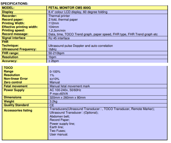 DOPLR-CMS800G-MACH: Model CMS800G,8.4” LCD screen, folding 60 degree-Ultrasound Frequency:1Mhz- Displays waveform and digital at same time-FHR range:50-210bpm with normal area highlight between 120-160bpm- Power:AC 100-240v, 50/60Hz with Battery back up of 3hrs operation from full charge-Thermal printer Built-in PC Network that can connect to a central monitoring system-Dim: 320mm x 260mm x 80mmx 3.2kg