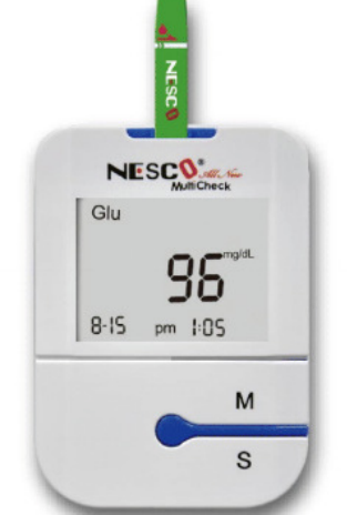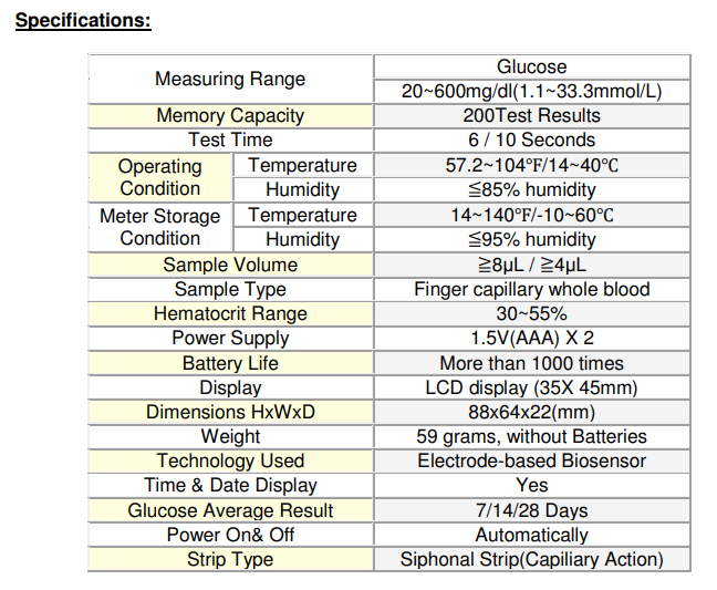 TEST-GLUCOSE/NW03 : Range:20~600mg/dl or 1.1~33.3mmol/L -Result in 6-10s – 2x AAA Batteries- LCD display 35X 45mm- Dim:88x64x22(mm) x 59g – Auto Power ON/OFF – 5x Test strips- Lancet -Carry case-Log book- Average result 7/14/28 Days
