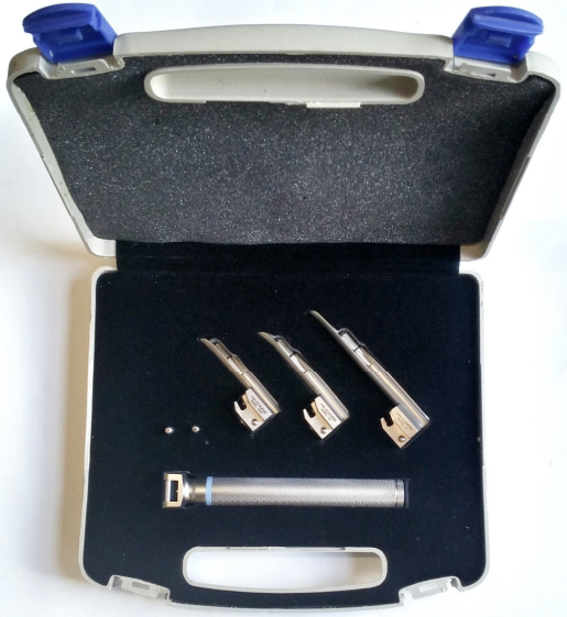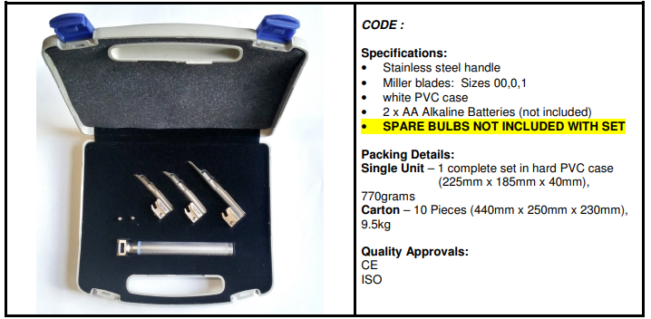 EQUILARYNG-PAED-FO-3SETMIL :Blades sizes 00, 0, 1 Miller, 1x handle in white PVC case , 2 x C Alkaline batteries . CE, ISO