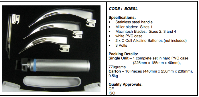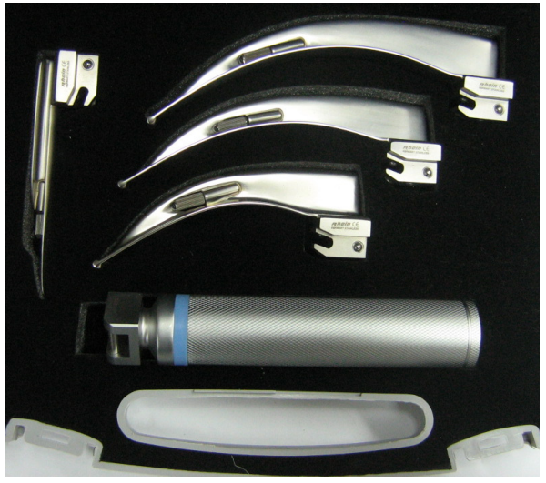 MOC-LARYNG-4SETMIX :1x Miller size 1 plus 3xMctosh sizes 2,3 & 4 in white PVC case , 1x handle, 2x Bulbs ,2 x C Alkaline batteries ( not incl).