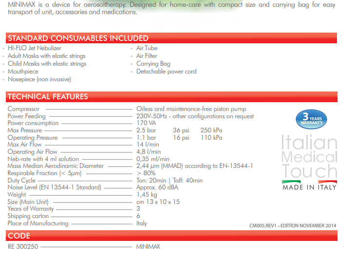 EQUINEBMINMA : Airflow 4.8L/mn-14l/mn- Nebulization rate 0.35ml/mn -65 dB, 1.45Kg -Detachable power cord