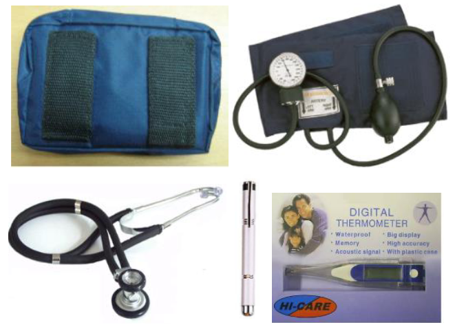 NURS-BAGKIT :Bp Aneroid, Rappaport Stethoscope ,Pupil Torch and Digital Flexi-tip Thermometer all in a handy Velcro bag ( blue or red colour)