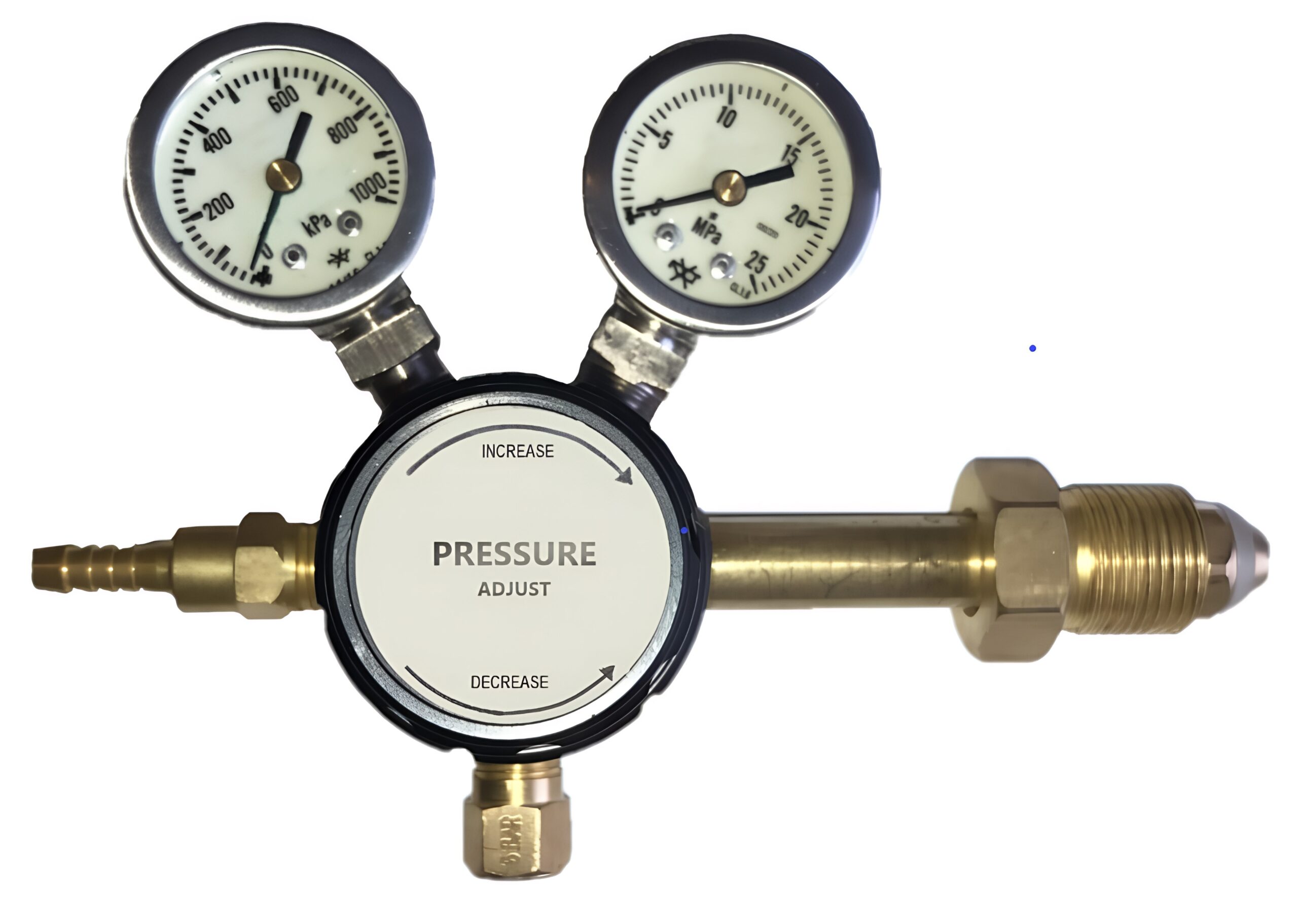 To adjust pressure to prescribed level via dial pressure valve – 6mm barb outlet connection – Bull nose input – Double gauge indicating stored and working pressures, the later adjustable up to maximum 600 Kpa/ 6 Bar /87 PSI -Available in medical air, medical Entonox, medical carbon dioxide and medical Nitrous oxide.