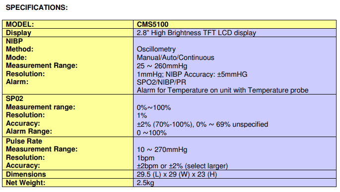 PATIENTMON-CMS5100 :Model CMS5100: .8”, High brightness TFT LCD display-r Adult, Pediatric and neonatal-Parameters: NiBp/SpO2/Pulse- Data Storage & M- Management ( NiBp’s up to 2000 groups & Spo2 up to 48hours) – Adjustable Visual and Audio alarms – Battery Li-Polymer rechargeable-Dim : 29.5 (L) x 29 (W) x 23 (H) x 2.5Kg