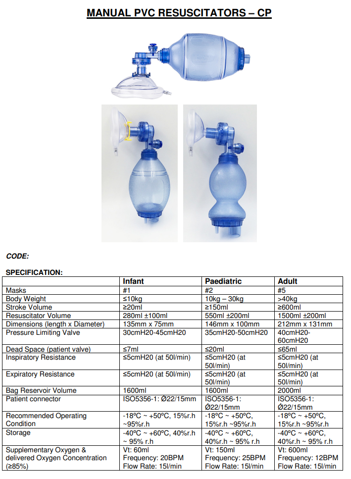 MOC-RESUS-PVC/A/C/I (CP : Includes :1x Mask , 1x Patient Valve with Pressure Relief Valve ,1xSilicone Bag ,1x Reservoir valve, 1x Oxygen Reservoir