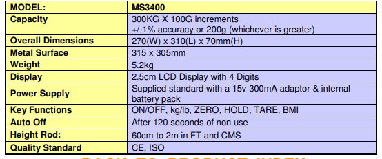 SCAL-BMI-HEIG-MS3400 : Model MS3400 : Max weight 300Kg +/-1% or +/200g (if greater), Platform : 31.5 x 30.5cm , LCD Display 2.5 cm , Internal Battery (Adaptor) , Height Rod : 60cm-2m , Auto power off in 2mn , 5.2Kg.