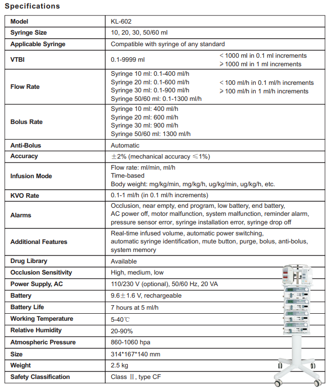 PUMP-SYRING-KL602 : Compatible with syringe of any standard sizes 10,20,30,50/60ml-VTBI : 0.1-9999ml/h- Flows/ Bolus Rates: