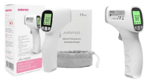 Model JDFR202 Non contact Hygemic Infrared Thermometer – Measuring Range 1-3cm -Temperature range 35˚C – 42.2˚C- Accuracy +/- 0,2 ˚C -HD LCD – 2X AAA Battery – Memory : 20 Sets of measurements -Auto Shut off in 10 s- Storage bag ( Objects & foreheads)