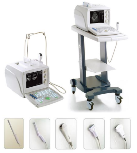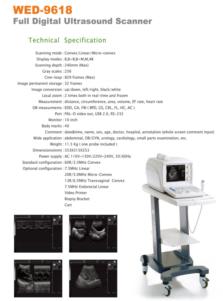 USWED9618 : Model WED9618 : 10” inch Black white LCD screen-Dim 353x315x253mm x11.5Kg -Depth scan 24cm max – Local Zoom x2 – Image conversion : up/down, Left/right, Black/White – Measurements : distance, circumference, surface,volume, Ejection fraction, HR. -Patient Management info- Power AC 110-130V / 220-240V , 50/60Hz—Connection Ports USB 2.0 , RS232 & PAL-D Video out- Supplied with a convex probe.- Optional Probes:7.5MHz Linear, 20R/5.0MHz, 13R/6.5 Transvaginal, 7.5MHz Endorectal Linear – Trolley optional